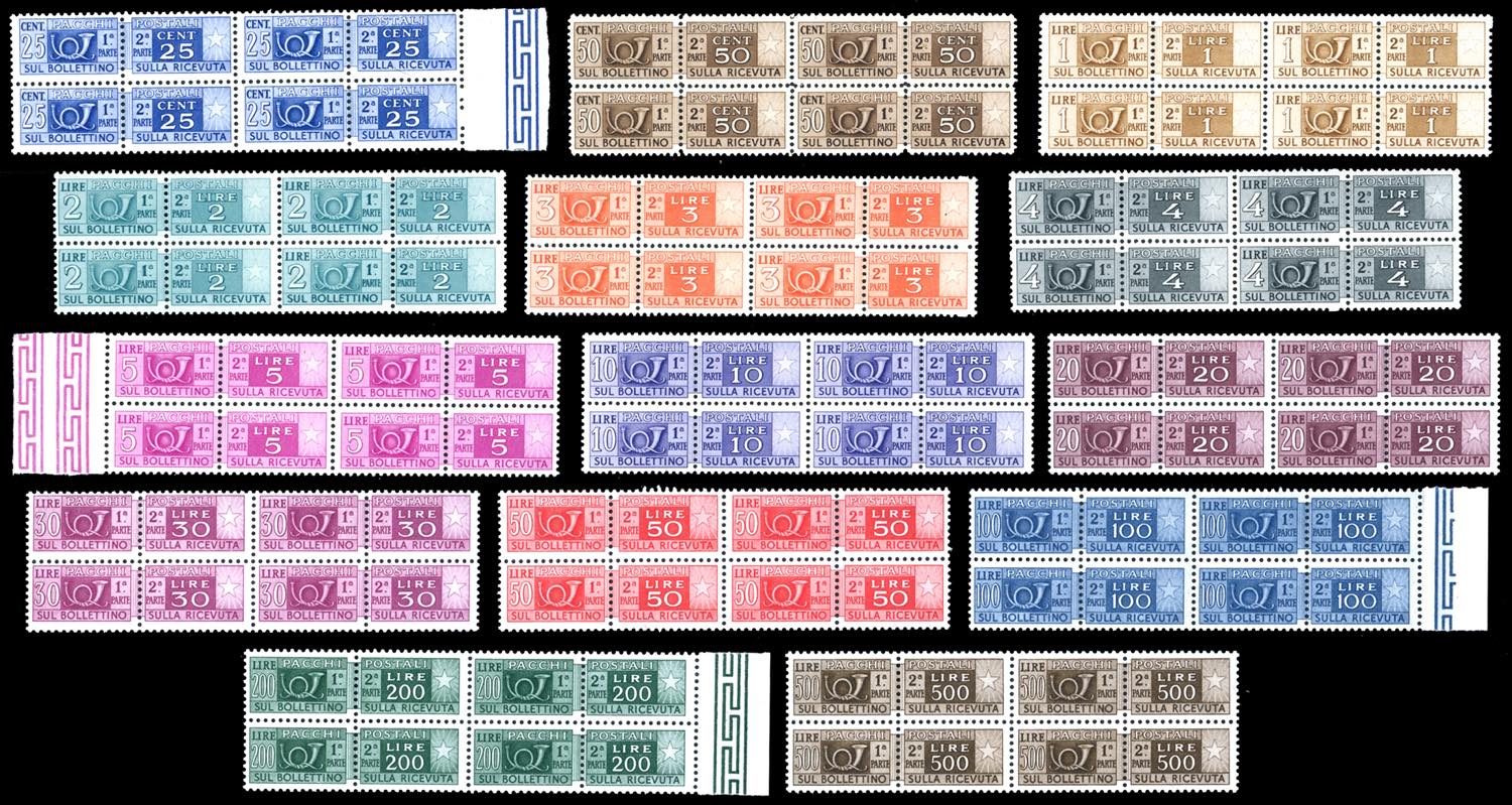 1946/51 - Filigrana ruota, serietta di 14 valori (66/78,80), blocchi di quattro, ottima centratura per il 500 lire, gomma originale integra, perfetti e molto freschi. (cat.Sassone 2.600/3.900 €).