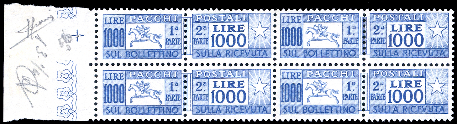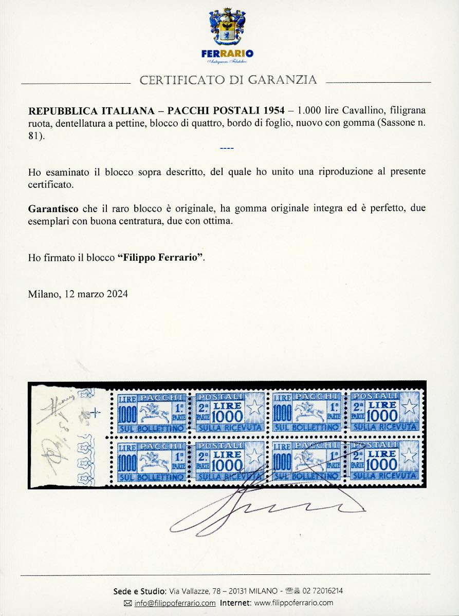 1954 - 1.000 lire Cavallino, filigrana ruota, dentellatura a pettine (81), blocco di quattro, bordo di foglio, nuovo, gomma originale integra, perfetto, due esemplari con buona centratura, due con ottima. Bellissimo e raro. Cert. Sorani e Ferrario.(Sassone € 19.000/30.000).