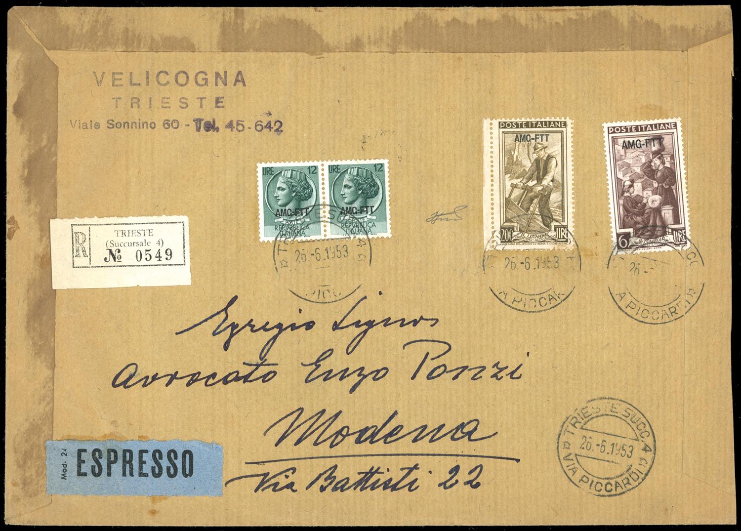 1953 - 200 lire e 6 lire Lavoro, 12 lire Siracusana, coppia (107,93,170), perfetti, su busta raccomandata espresso da Trieste 26/6/1953 a Modena. Raro uso del 200 lire Lavoro su lettera diretta in Italia. Ferrario.