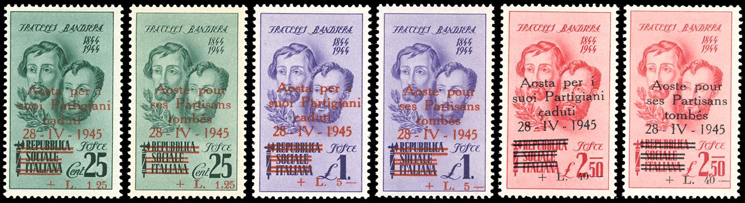 AOSTA EMISSIONE AUTONOMA DI PROPAGANDA 1945 - Fratelli Bandiera, una serie completa con soprastampa in italiano e una con soprastampa in ... Leggi tutto