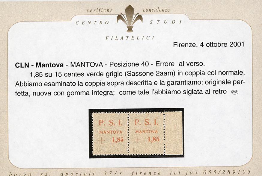 MANTOVA 1945 - 1,85 lire + 15 cent., soprastampa recto verso, al verso varietà "MANTOvA", in coppia con il normale (2aam,2aa), bordo di foglio, gomma originale integra, perfetta. Cert. Centro Studi Filatelici Firenze.