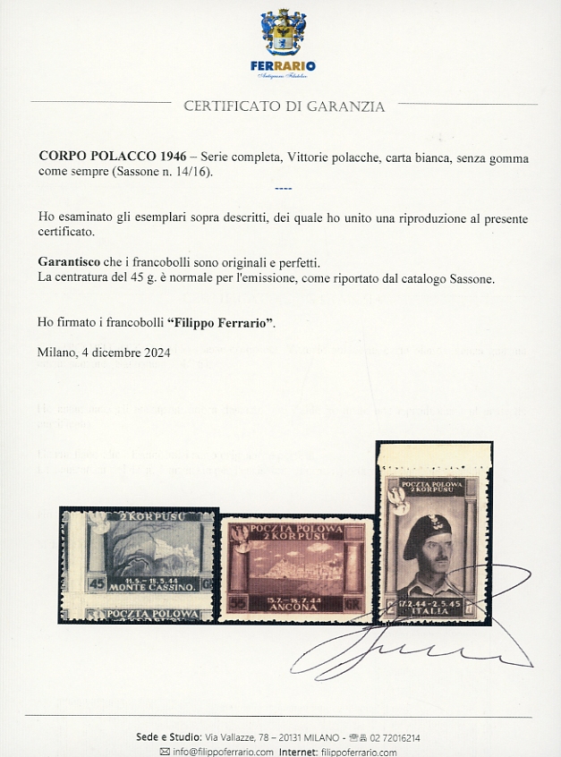 1946 - Vittorie polacche, carta bianca, serie completa (14/16), senza gomma come sempre, perfetti, centratura del 45 g. normale per l'emissione, come riportato dal cat. Sassone. Rari. Cert. Ferrario.