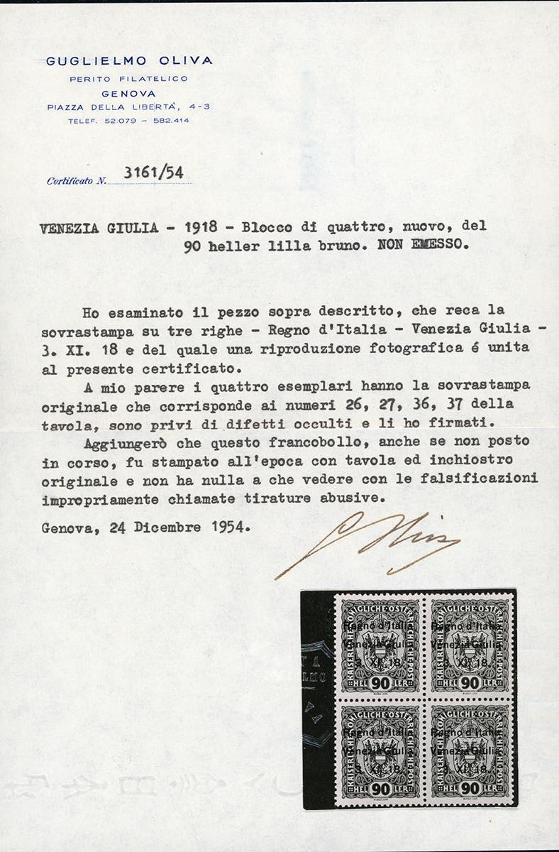 VENEZIA GIULIA 1918 - 90 h. lilla rosso, soprastampato, non emesso, posiz. 36 del foglio (17A), nuovo, gomma originale integra, perfetto. Splendido e molto raro. Tiratura 50 esemplari. Cert. G.Oliva del blocco di provenienza, oro Raybaudi e Ferrario.