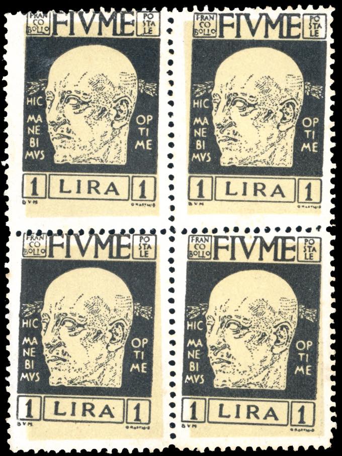FIUME 1920 - 1 lira D'Annunzio (122), stampa del nero obliqua, blocco di quattro, gomma originale integra, perfetto. Bella ed interessante ... Leggi tutto