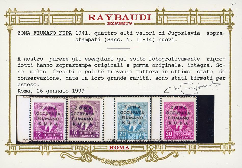 ZONA FIUMANO KUPA 1941 - Prima emissione soprastampata, serie completa (1/14), per lo più bordo di foglio, nuovi, gomma originale integra, perfetti e molto freschi. Molto rari e di splendida qualità. Sorani, cert. Oro Raybaudi per gli alti valori.