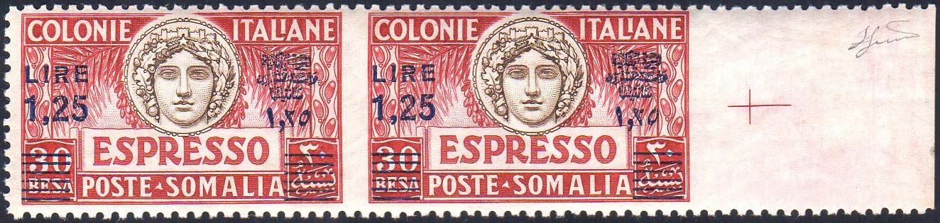 ESPRESSI 1927 - 1,25 lire su 30 b. rosso e bruno, dent. 11, coppia orizzontale non dentellata al centro e a destra (7e), nuova, gomma originale integra, perfetta. Molto fresca e rara. Ferrario.