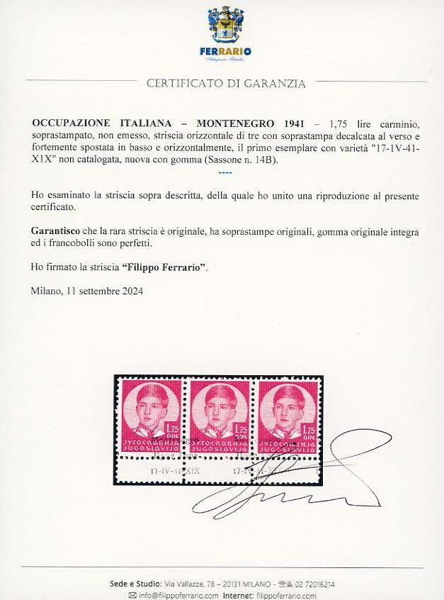 MONTENEGRO 1941 - 1,75 lire carminio, soprastampato, non emesso, striscia orizzontale di tre con soprastampa decalcata al verso e fortemente spostata in basso e orizzontalmente, il primo esemplare varietà "17-1V-41-X1X" non catalogato (14B), nuova, gomma originale integra, perfetta. Molto bella e rara! Cert. Raybaudi e Ferrario.