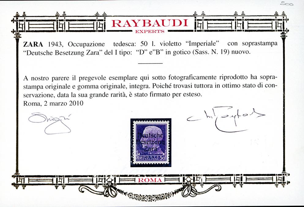 OCCUPAZIONE TEDESCA ZARA 1943 - 50 lire soprastampato "Deutsche Besetzung Zara", I tipo "D" e "B" in gotico (19), nuovo, gomma originale integra, perfetto. Estremamente raro, tiratura 47 esemplari. Timbrino Ludin BPP, cert. Oro Raybaudi e Ferrario.