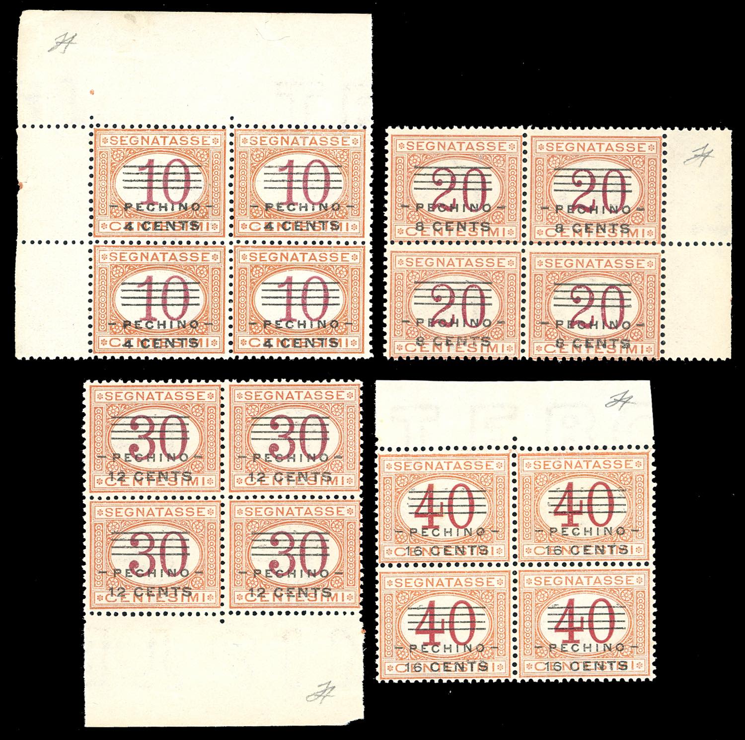 PECHINO SEGNATASSE 1919 - Nuova soprastampa, non emessi, serie completa (9/12), blocchi di quattro, bordo di foglio, nuovi, gomma originale integra, perfetti. Molto belli. Ferrario.