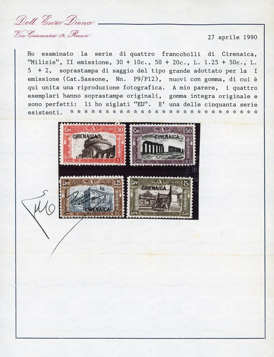 1929 - Milizia II emissione, soprastampa in caratteri grandi, adottata per la prima emissione, serie completa (P9/P12), gomma originale integra, perfetti. Molto rari, tiratura 50 serie. Cert. E.Diena.
