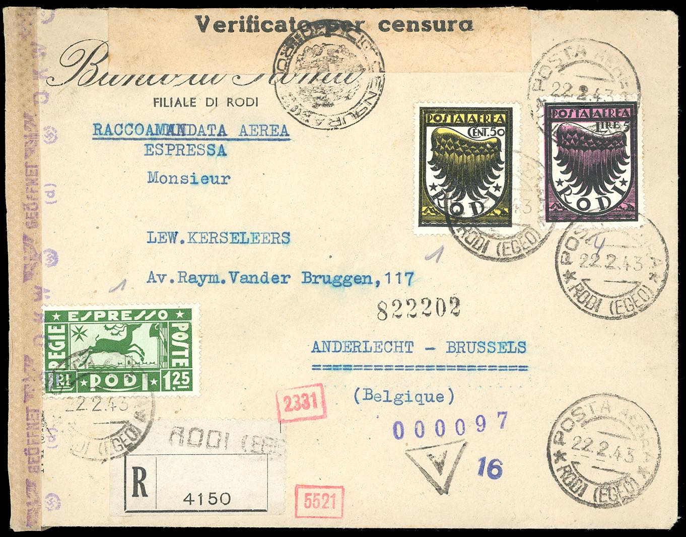 POSTA AEREA 1943 - 50 cent. e 5 lire Ala stilizzata, 1,25 lire Espresso (A30,A33,E1), perfetti, su aerogramma raccomandato espresso da Rodi 22/2/1943 per il Belgio, bolli e fascette di censura. Interessante e non comune.