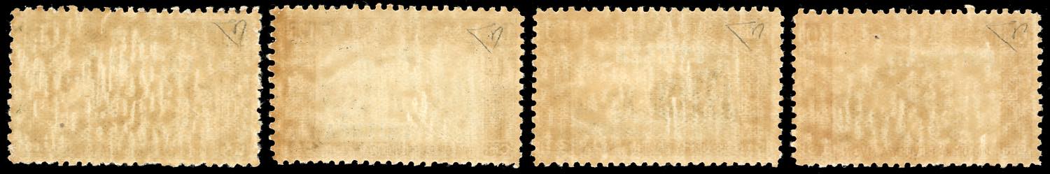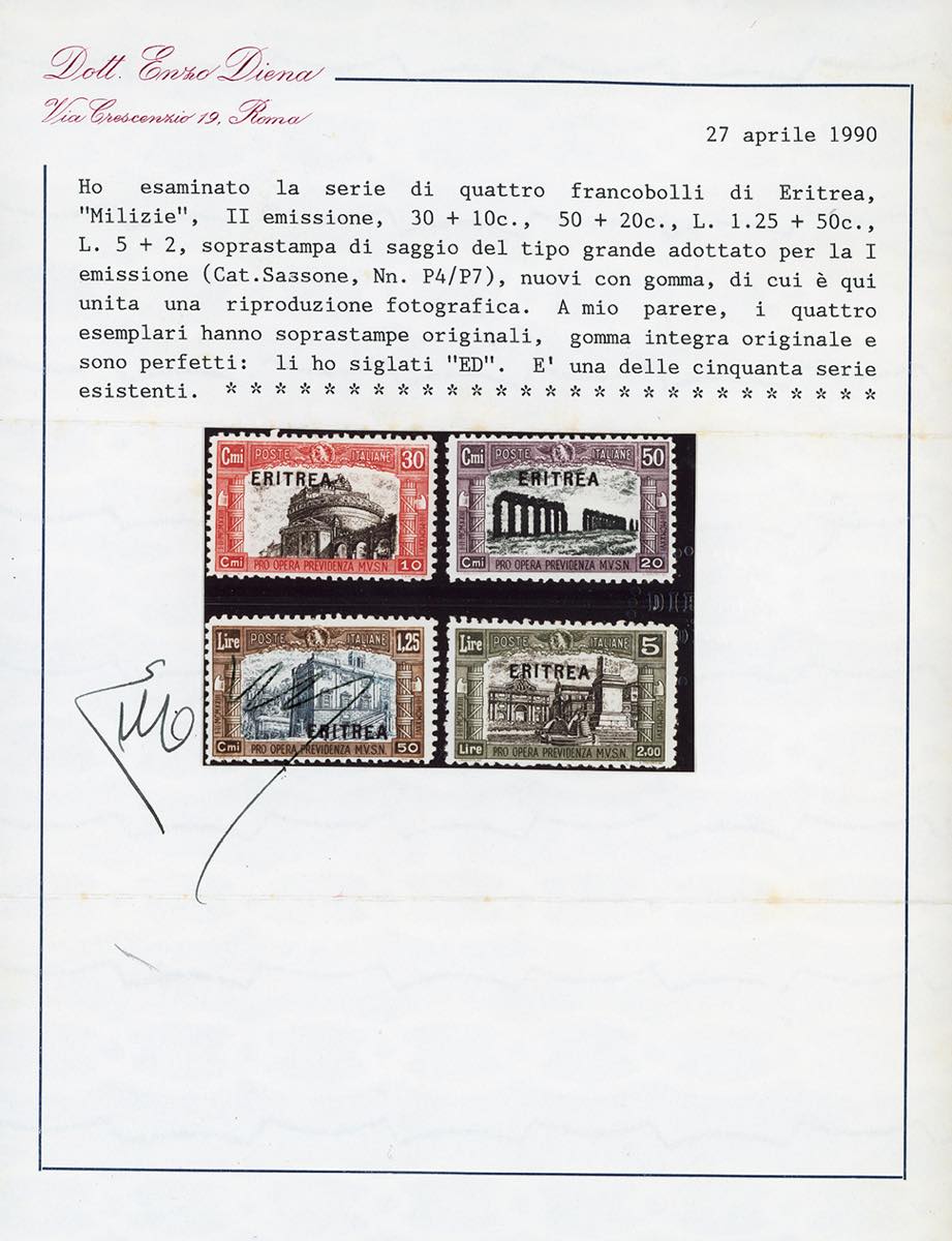 1929 - Milizia II emissione, soprastampa in caratteri grandi, adottata per la prima emissione, serie completa (P4/P7), perfetti, gomma originale integra. Molto rari, tiratura 50 serie. Cert. E.Diena.
