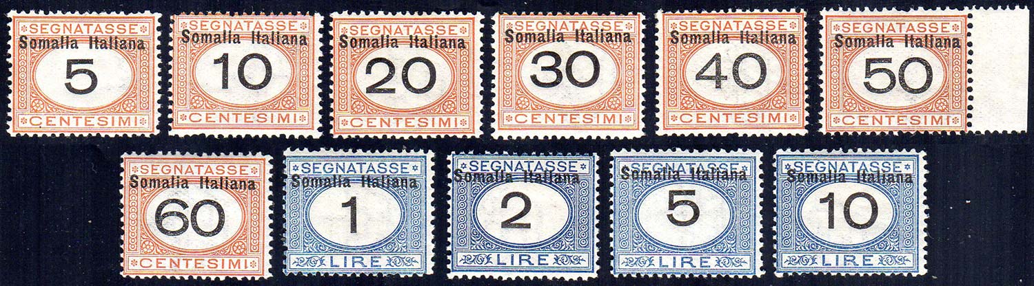 SEGNATASSE 1926 - Cifre nere in moneta italiana (41/51), gomma integra, perfetti. Ottima qualità. Bottacchi per gli alti valori.