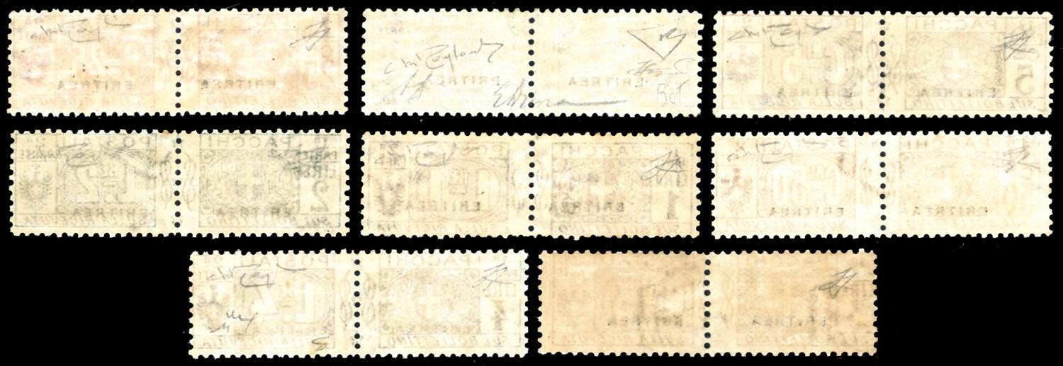 PACCHI POSTALI 1916 - Soprastampati, serie completa (1/8), gomma originale integra, perfetti. Rari e di ottima qualità. Il raro 10 cent. firme Em. e A.Diena e cert. E.Diena, la serie firmata Raybaudi e cert. Ferrario.