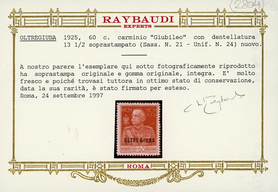 1925 - 60 cent. carminio Giubileo, dent. 13 1/2 (24), nuovo, gomma originale integra, perfetto. Freschissimo e ben centrato. Rarità del settore. Cert. Oro Raybaudi.