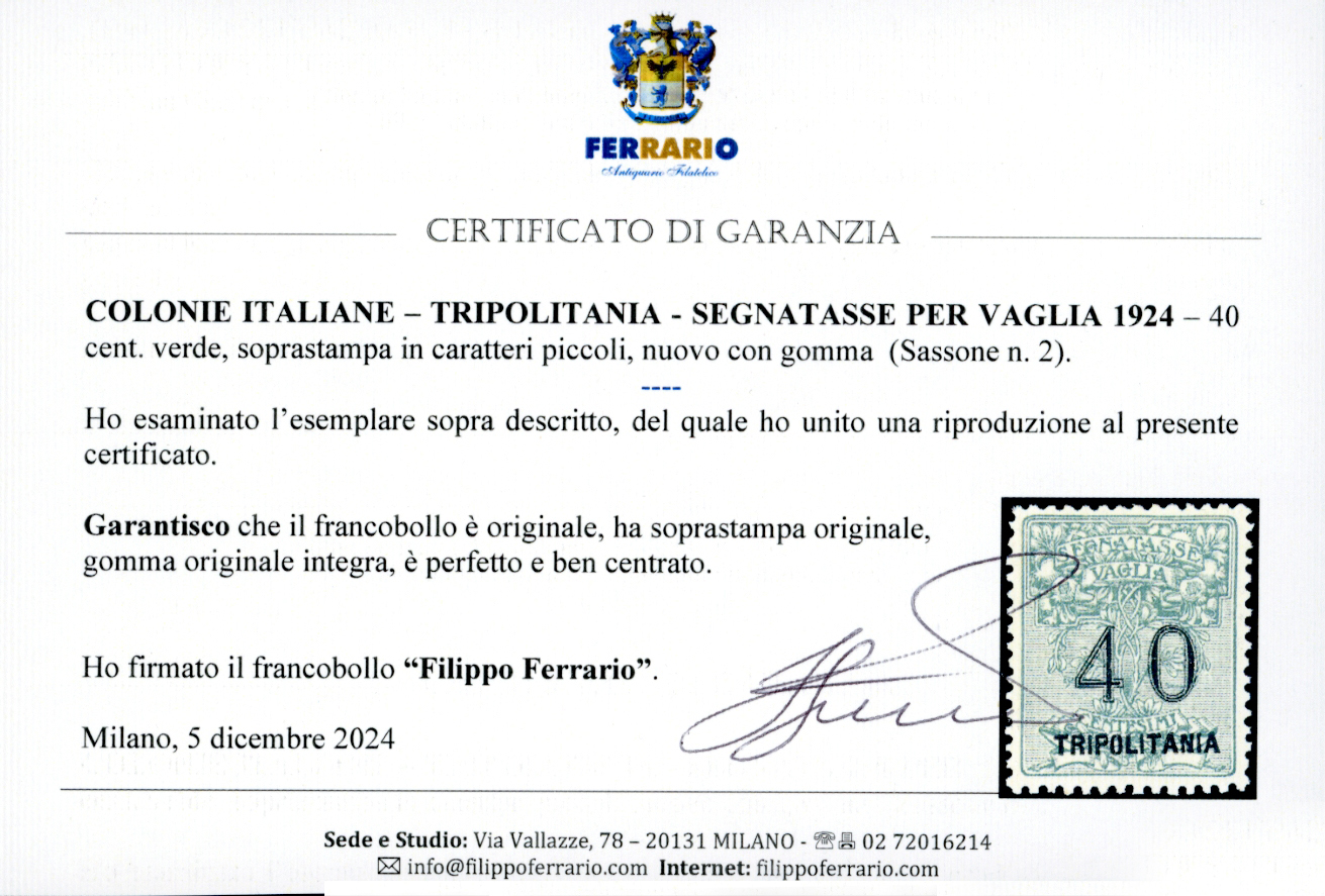 SEGNATASSE VAGLIA 1924 - 40 cent. verde, soprastampa in caratteri piccoli (2), nuovo, gomma originale integra, perfetto e ben centrato. Molto bello e raro di questa qualità. Cert. Caffaz e Ferrario.
