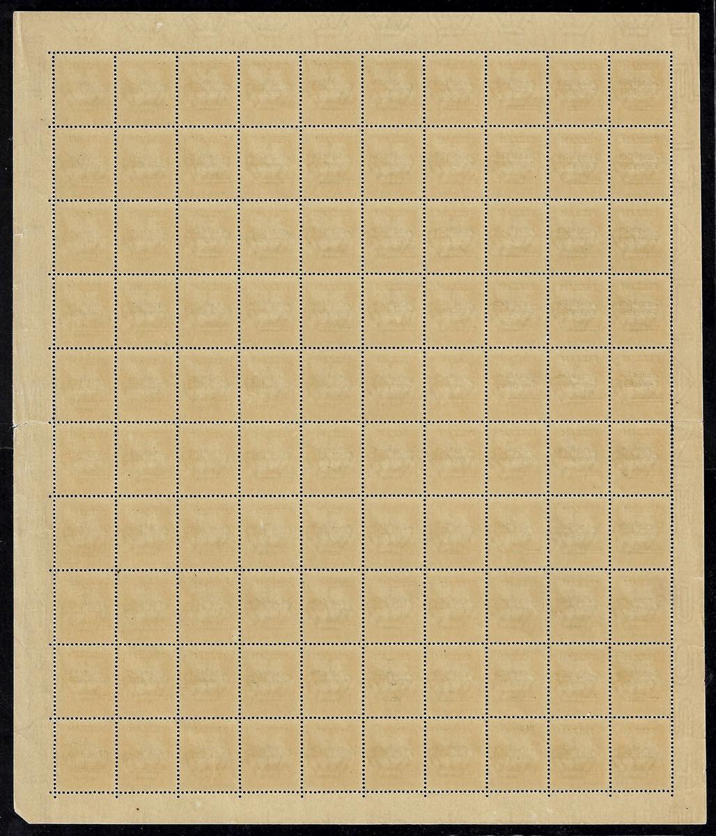 OCCUPAZIONE FRANCESE FEZZAN POSTA AEREA 1943 - 50 cent. soprastampato (1), foglio completo di 100 esemplari, gomma originale integra, perfetto, leggermente aperto in alcuni punti lungo i bordi. Dei 37 fogli soprastampati è probabilmente l'UNICO ad oggi rimasto ancora intero. Ferrario, cert. Oro Raybaudi.
