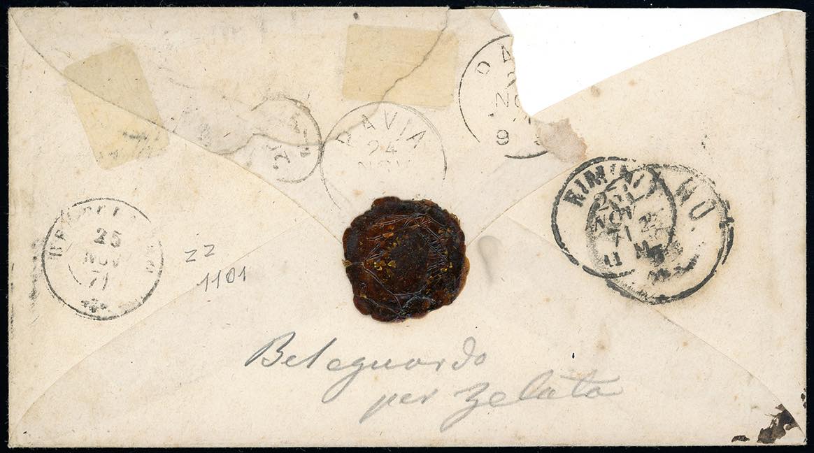 1871 - 10 cent. De La Rue, tiratura di Londra (F4L), coppia perfetta, su busta da San Marino 23/11/1871, doppio cerchio in azzurro e bollo ... Leggi tutto