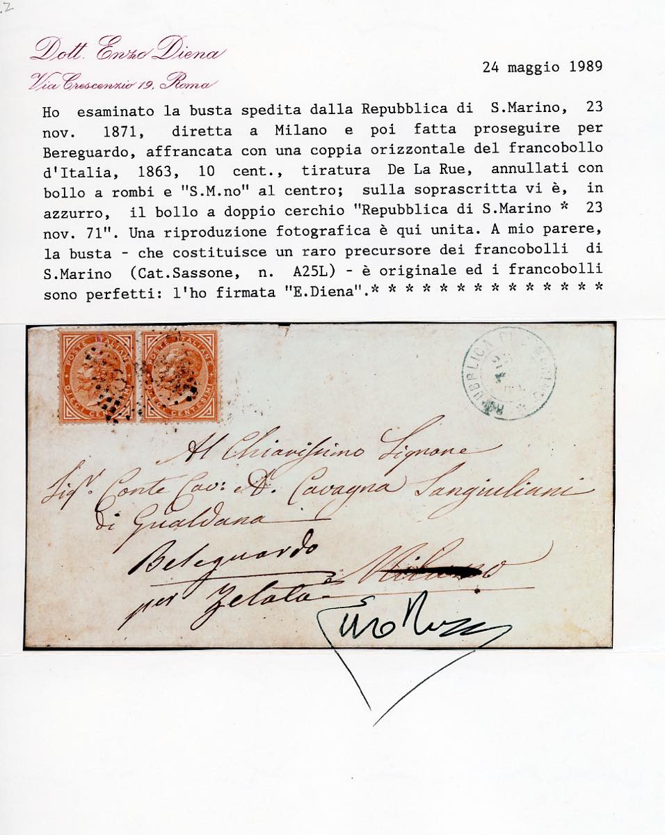 1871 - 10 cent. De La Rue, tiratura di Londra (F4L), coppia perfetta, su busta da San Marino 23/11/1871, doppio cerchio in azzurro e bollo a punti in nero, per Milano, rispedita a Zelata. Rara! Cert. Diena.