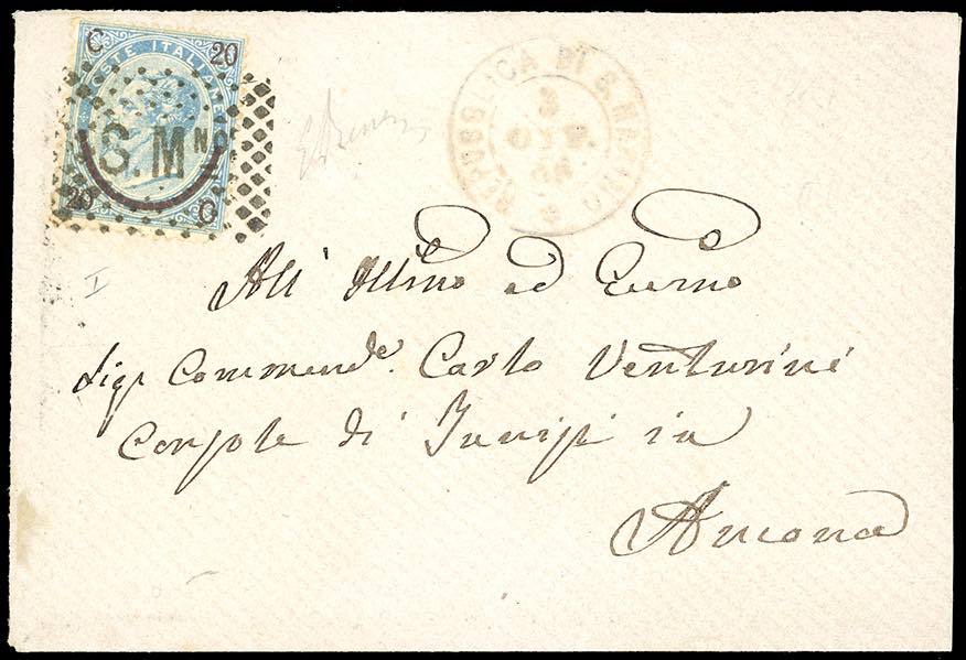 1866 - 20 cent. su 15 cent. Ferro di cavallo, I tipo, annullato con il bollo a punti (F8), lieve difetto, su piccola busta da San Marino 3/10/1866 ad Ancona. Ottimo aspetto. Em.Diena.