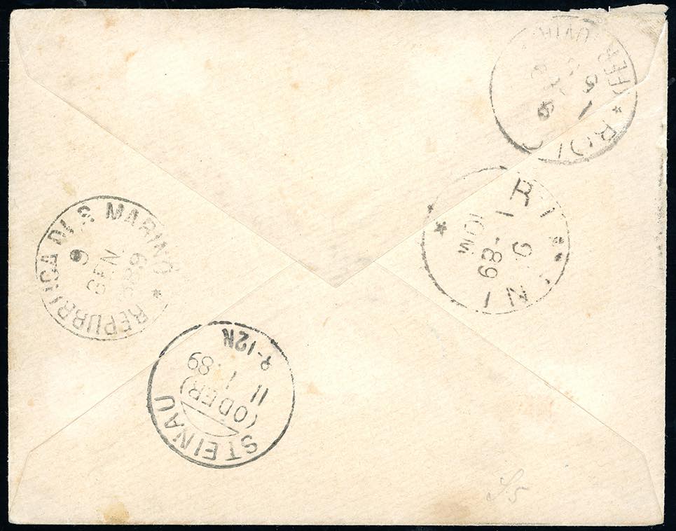 1889 - 40 cent. lilla scuro Stemma (7), bordo di foglio, con gran parte di numero di tavola in rettangolo, perfetto, su busta da San Marino ... Leggi tutto