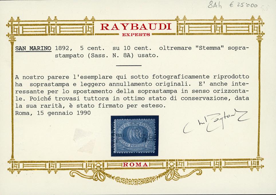 1892 - 5 cent. su 10 cent. oltremare Stemma, soprastampa fortemente spostata in senso orizzontale (8Ah), usato, perfetto. Francobollo molto raro, impreziosito dall'appariscente varietà. A.Diena, cert. Oro Raybaudi.