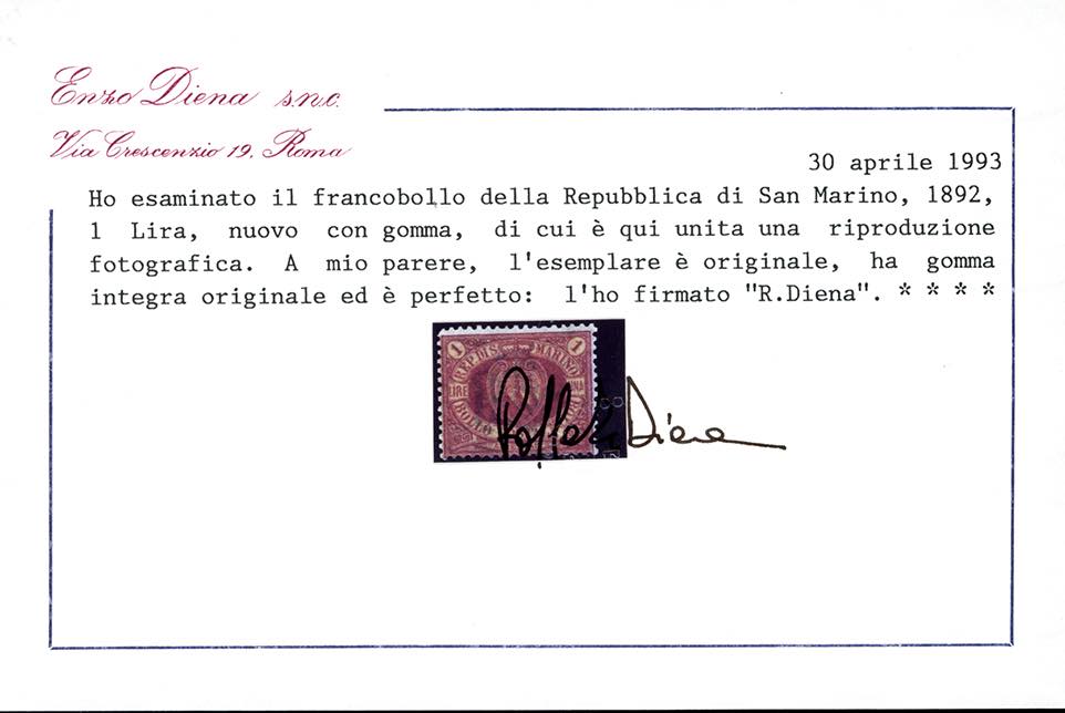 1892 - 1 lira carminio su giallo Stemma (20), nuovo, discreta centratura, gomma originale integra, perfetto. G.Bolaffi, A.Diena, Raybaudi, Sorani, cert. Diena.