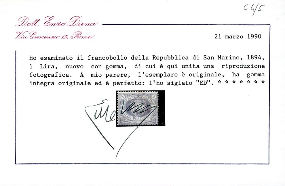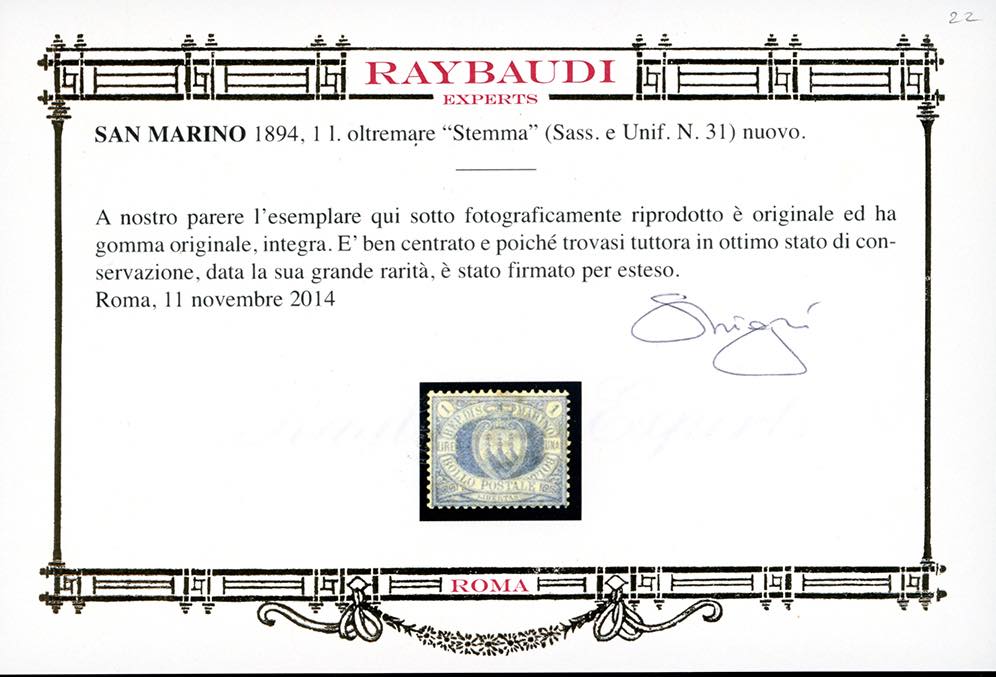 1894 - 1 lira oltremare Stemma (31), ben centrato, nuovo, gomma originale integra, perfetto. Cert. Oro Raybaudi ed E.Diena (cat.Sassone € 6.000/19.000).