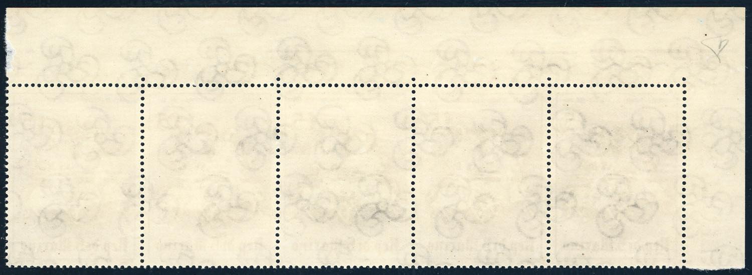 1963 - 5 lire Giostre e Tornei, striscia orizzontale di cinque, i primi quattro esemplari con stampa incompleta o evanescente (636a), angolo di foglio, gomma originale integra, perfetta. Molto rara. Cert. E.Diena.