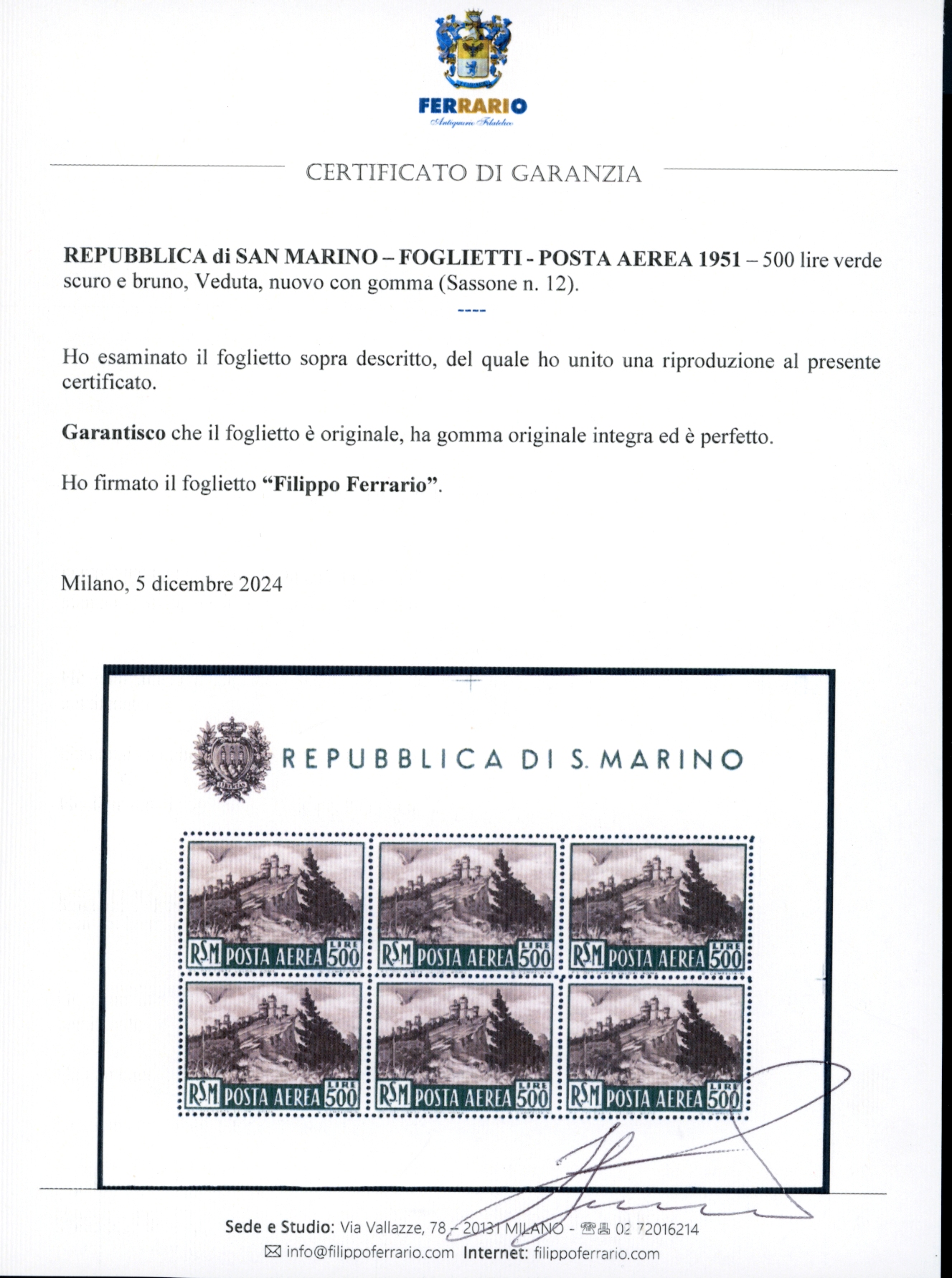 1951 - 500 lire Veduta, foglietto (12), nuovo, gomma originale integra, perfetto e di ottima qualità.