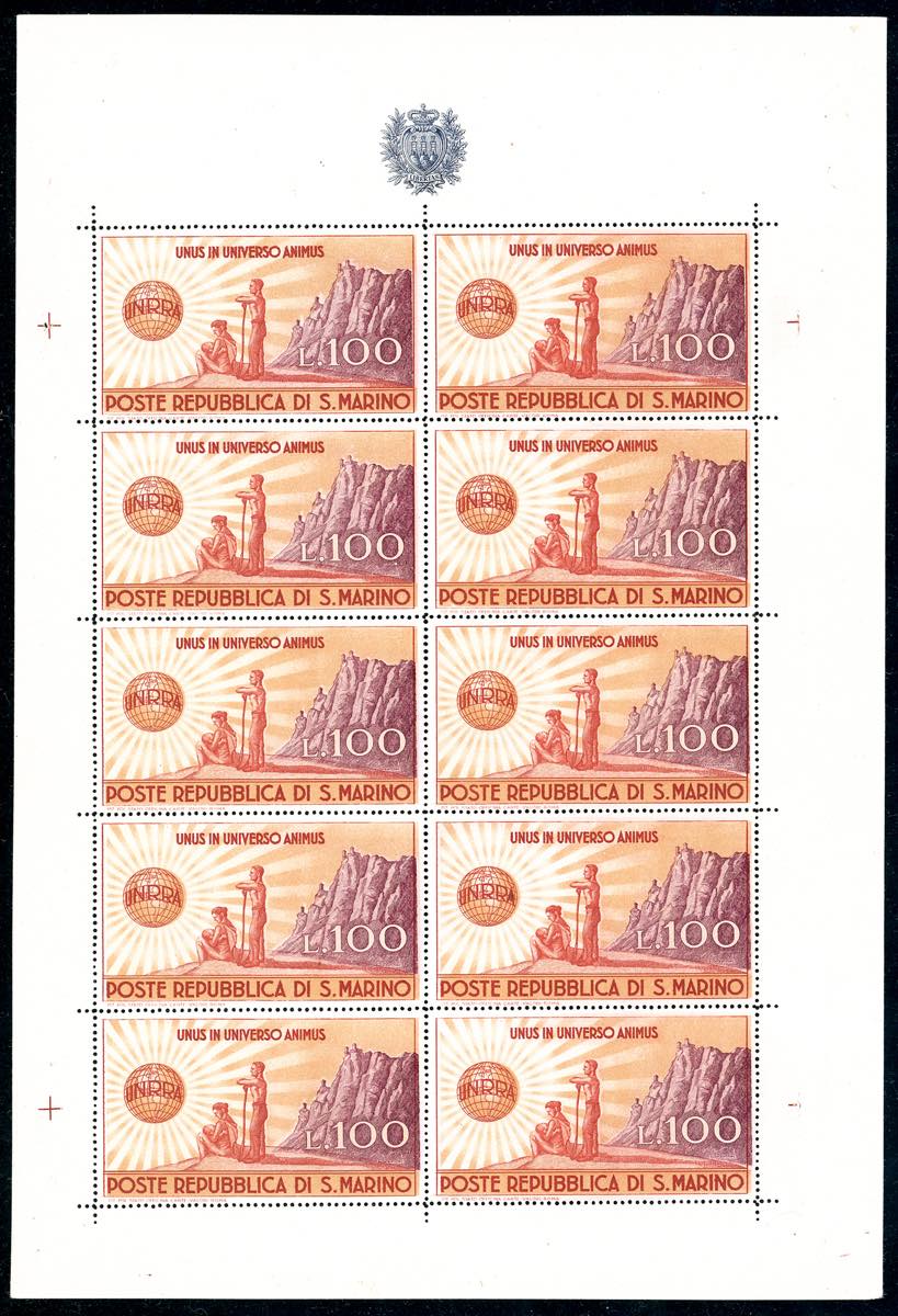 1946 - 100 lire UNRRA, minifoglio (6), senza piega, gomma originale integra, perfetto e di ottima qualità. Ferrario.