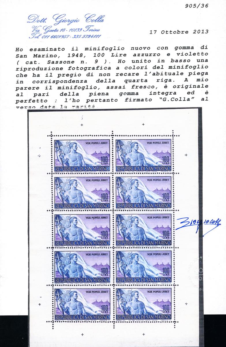 1948 - 100 lire Lavoratori, minifoglio (9), senza la consueta piega, nuovo, gomma originale integra, perfetto. Raro e di ottima qualità. G.Bolaffi, cert. Colla.