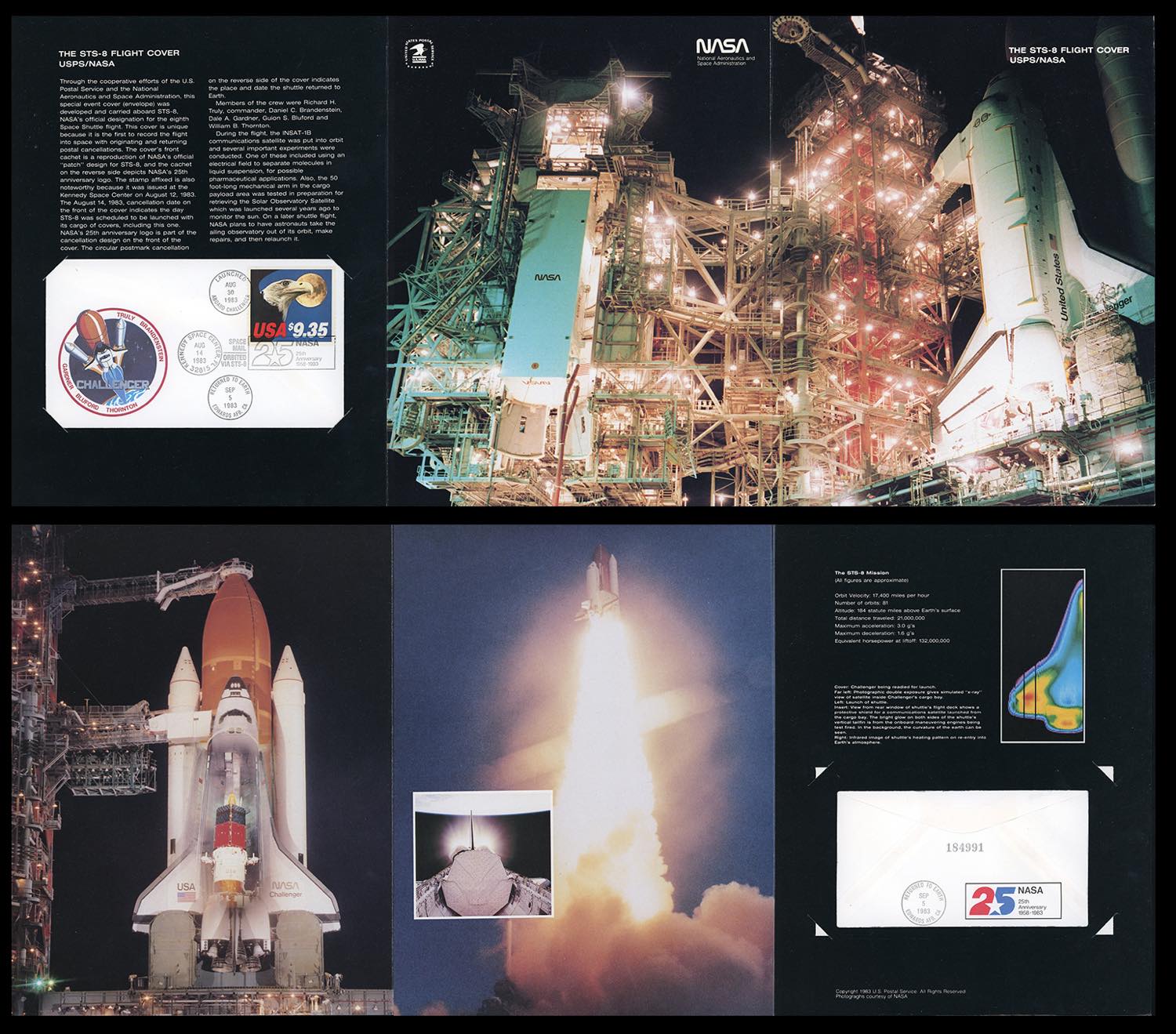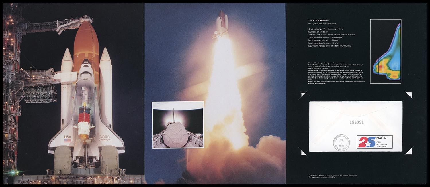STATI UNITI SPAZIO 1983 - Lettera speciale con primo trasporto ufficiale nel cosmo con la navicella Challenger, affrancata con 9,35 dollari. Annulli del Kennedy Space Center, "Aboard Challenger 30/8/1983" e ritorno alla base di Edwards 5/9/1983. Molto bella e corredata di folder speciale.