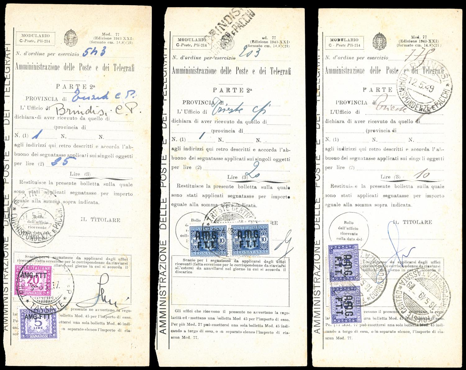 TRIESTE A AMG-FTT SERVIZI 1948/1953 - Interessante insieme di 5 moduli n. 77 variamente affrancati con segnatasse soprastampati e 4 ... Leggi tutto