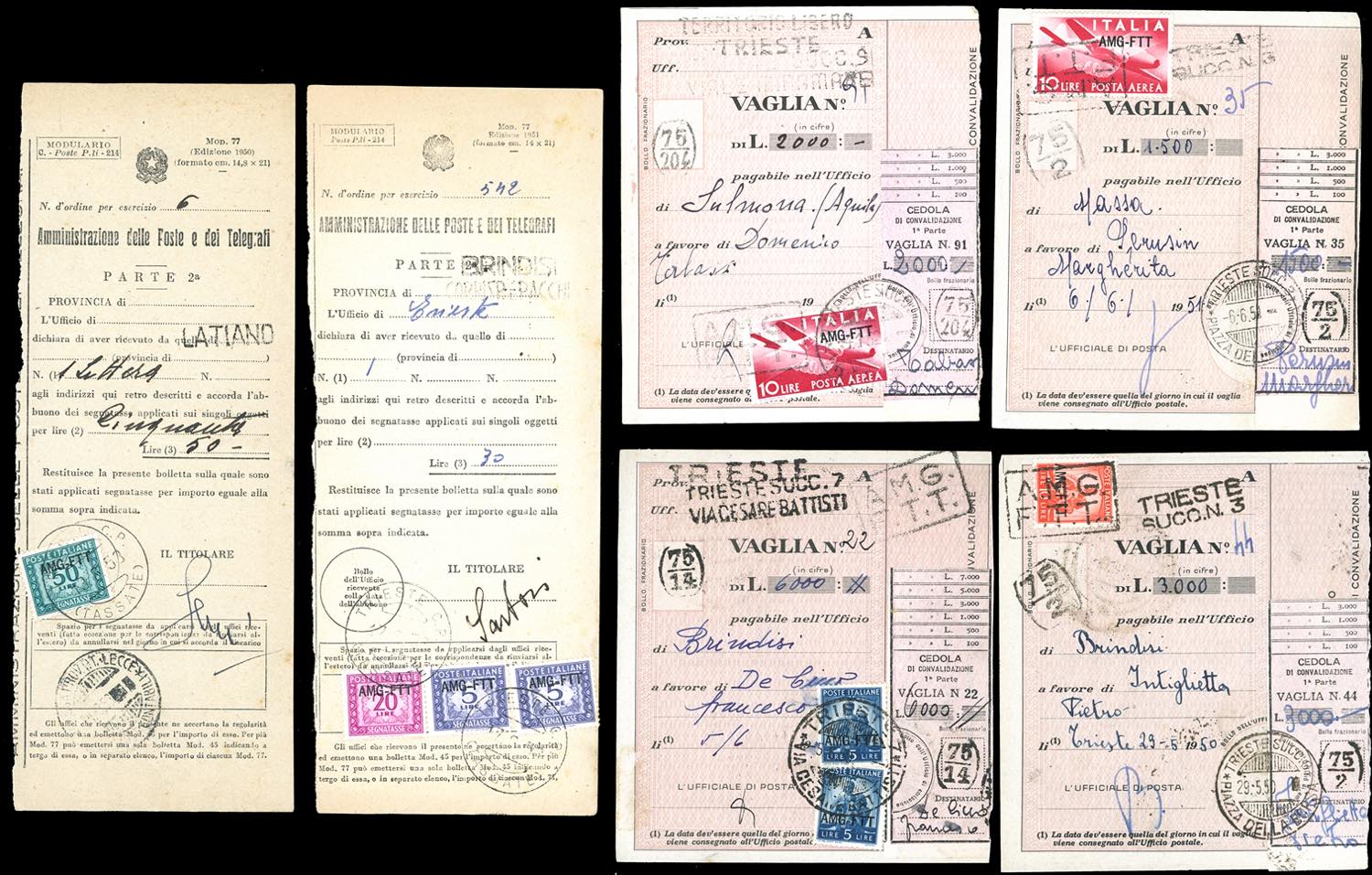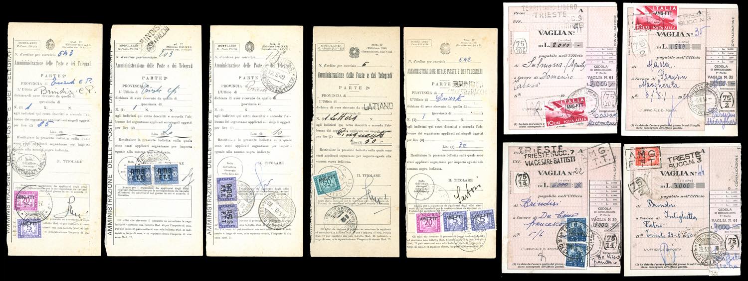TRIESTE A AMG-FTT SERVIZI 1948/1953 - Interessante insieme di 5 moduli n. 77 variamente affrancati con segnatasse soprastampati e 4 ricevute vaglia con affrancature integrative. Non comune insieme, per specialista.