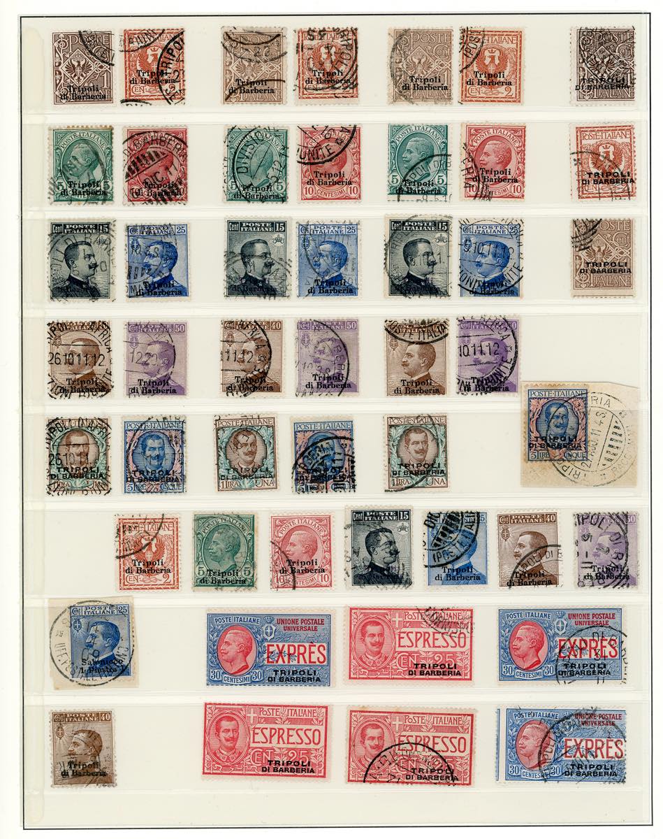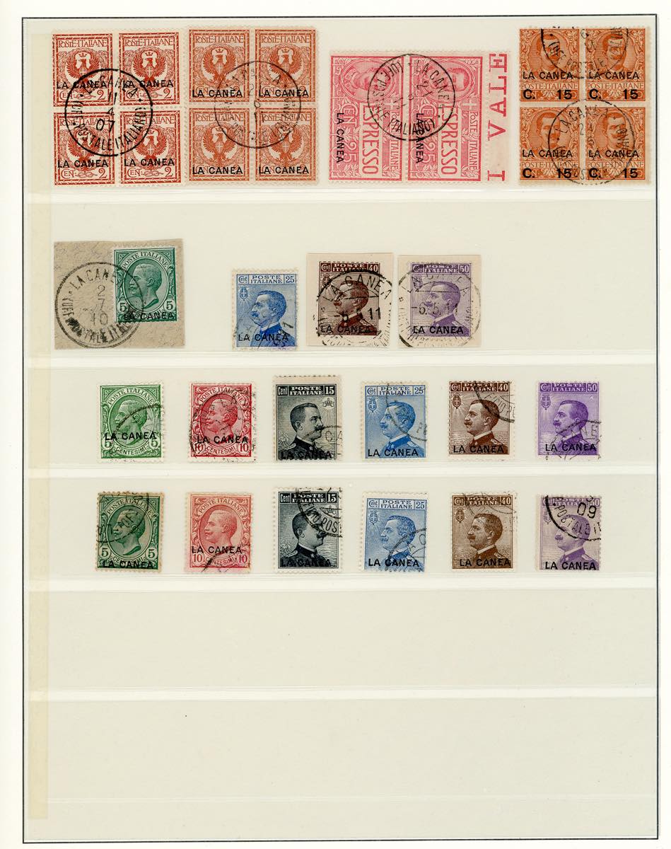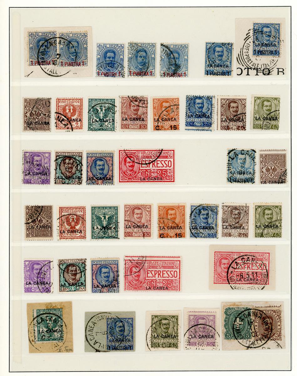 UFFICI POSTALI ALL'ESTERO 1874/1915 - Bell'insieme di serie complete, anche ripetute, e spezzature, nuove e usate, di francobolli di Levante Emissioni Generali, La Canea e Tripoli di Barberia, in pagine d'album. Alto valore di catalogo.