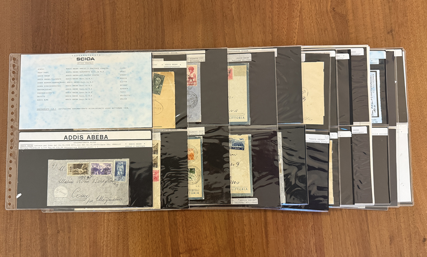 ETIOPIA GOVERNATORATO SCIOA' 1936/1940 - Collezione di 48 lettere e cartoline con annulli del periodo, montata in fogli d'album. Ottimo per studio o dettaglio.