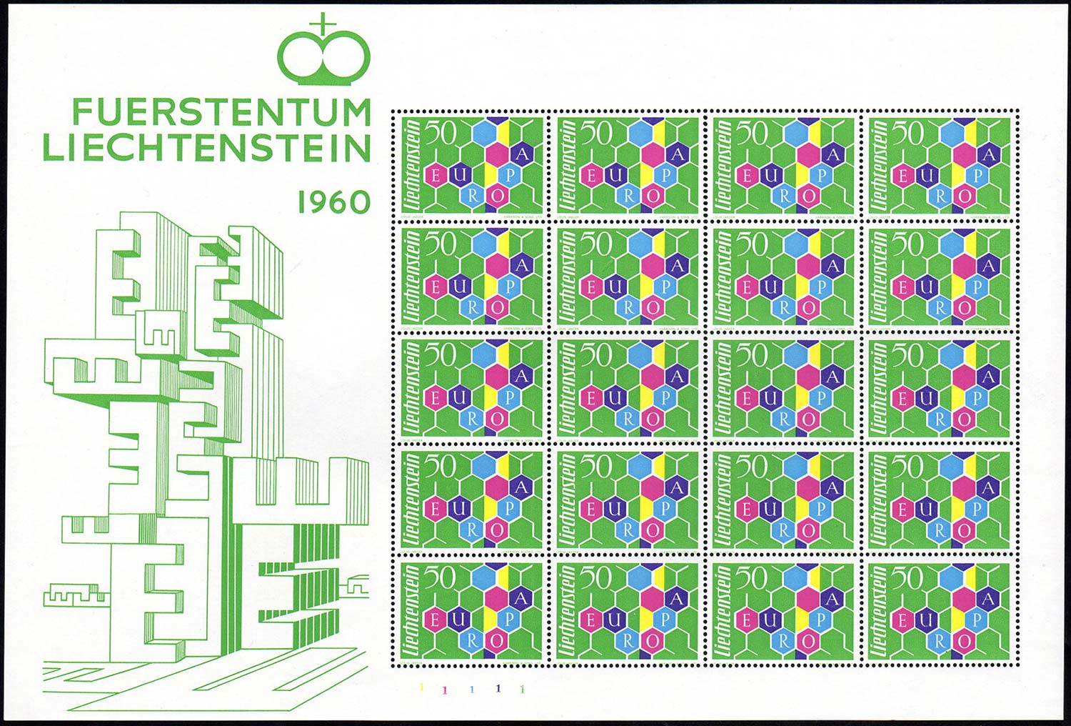 LIECHTENSTEIN FOGLIETTI 1960 - 50 r. Europa CEPT, I tiratura (355), minifoglio di 20 esemplari, gomma integra, perfetto.