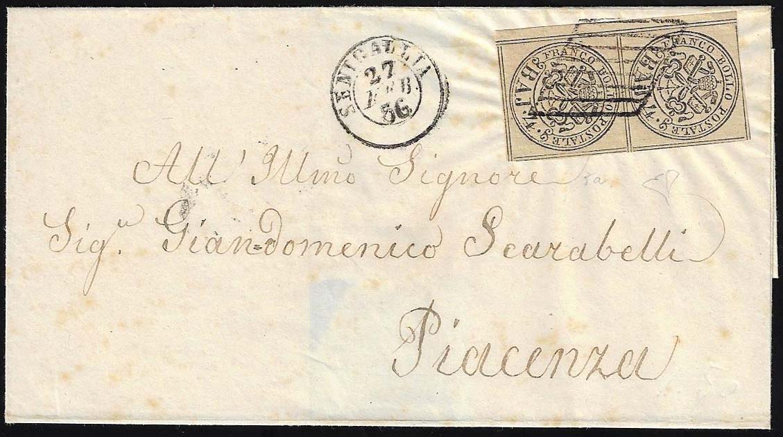 1856 - 4 baj bruno rosaceo chiaro (5a), coppia verticale, bordo di foglio, un esemplare "otto filetti", su sovracoperta di lettera da Senigallia 27/2/1856 a Piacenza. Bella! E.Diena. (cat. Sassone € 9.500 in proporzione).