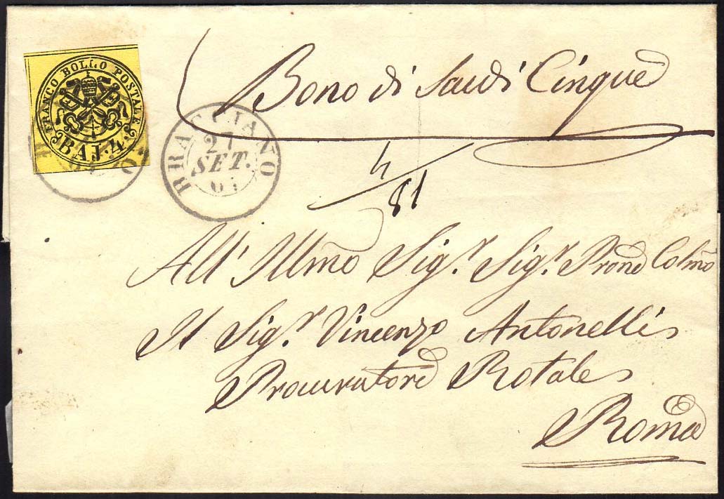 1864 - 4 baj giallo (5A), leggeremnete intaccato a destra, su fresca sovracoperta di lettera da Bracciano 27/09/1864 a Roma, manoscritto "Bono di scudi cinque". Rara assicurata valore contenente denaro.