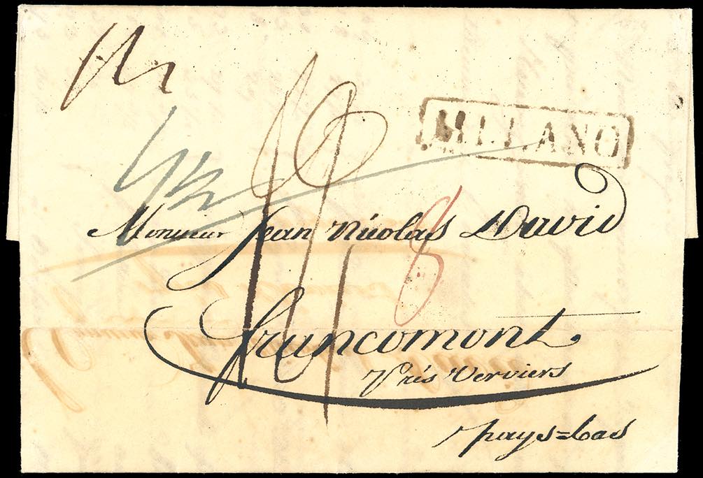 1824 - Lettera prefilatelica da Milano 28/1/1824 a Francomont, in Belgio, con diversi segni di tassazione sul fronte. Pregevole destinazione.