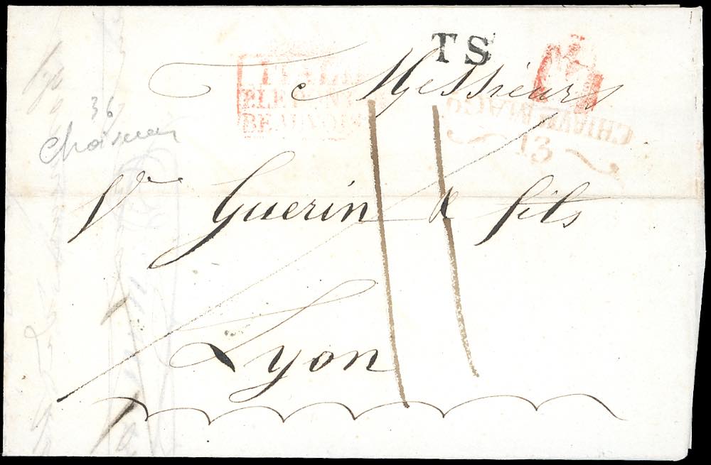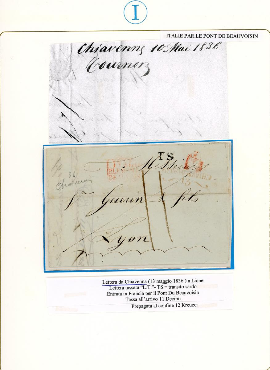 1836 - Lettera prefilatelica da Chiavenna 13/5/1836 a Lione, al verso la tassa pagata in partenza di 12 carantani e sul fronte la tassa in arrivo di 11 decimi. Sul fronte sono inoltre presenti il bollo TS (transito sardo) e quello di entrata in Francia per il Pont du Beauvoisin. Ex coll. Imperato.