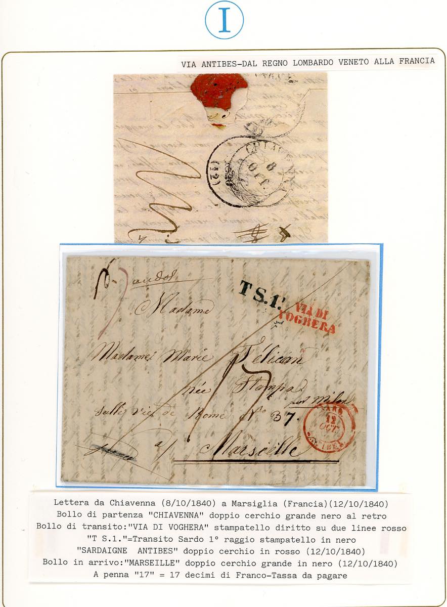 1840 - Lettera prefilatelica da Chiavenna 8/10/1840, datario di partenza al verso, a Marsiglia, tassata 17 decimi, lineare di transito "via di Voghera" in rosso e bollo TS1 (transito sardo I raggio) in nero. Non comune. Chiavarello. Ex coll. Imperato.