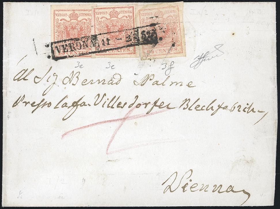 1851 - 15 cent. rosso vermiglio, due esemplari, 15 cent. rosso vermiglio chiaro, tutti I tipo, carta a mano (3e,3f), perfetti, su sovracoperta di lettera da Verona 11/2/1851 a Vienna. Bella e non comune affrancatura di valori gemelli di tinte differenti. Ferrario.