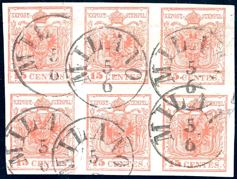 1845 - 15 cent. rosso vermiglio, III tipo, carta a macchina (20), blocco di sei esemplari, lieve piega orizzontale sui tre esemplari superiori, ben marginato, usato a Milano 5/6. Molto fresco, ottimo aspetto. (cat. Sassone €6.500 per il blocco di quattro).