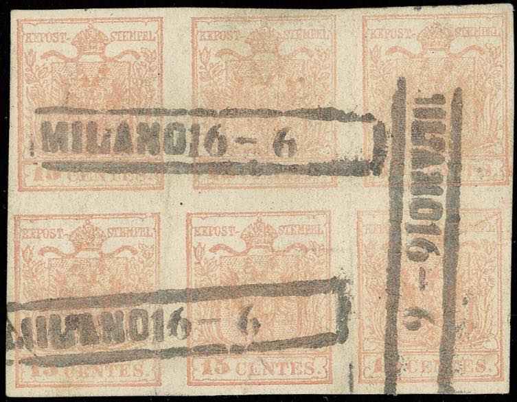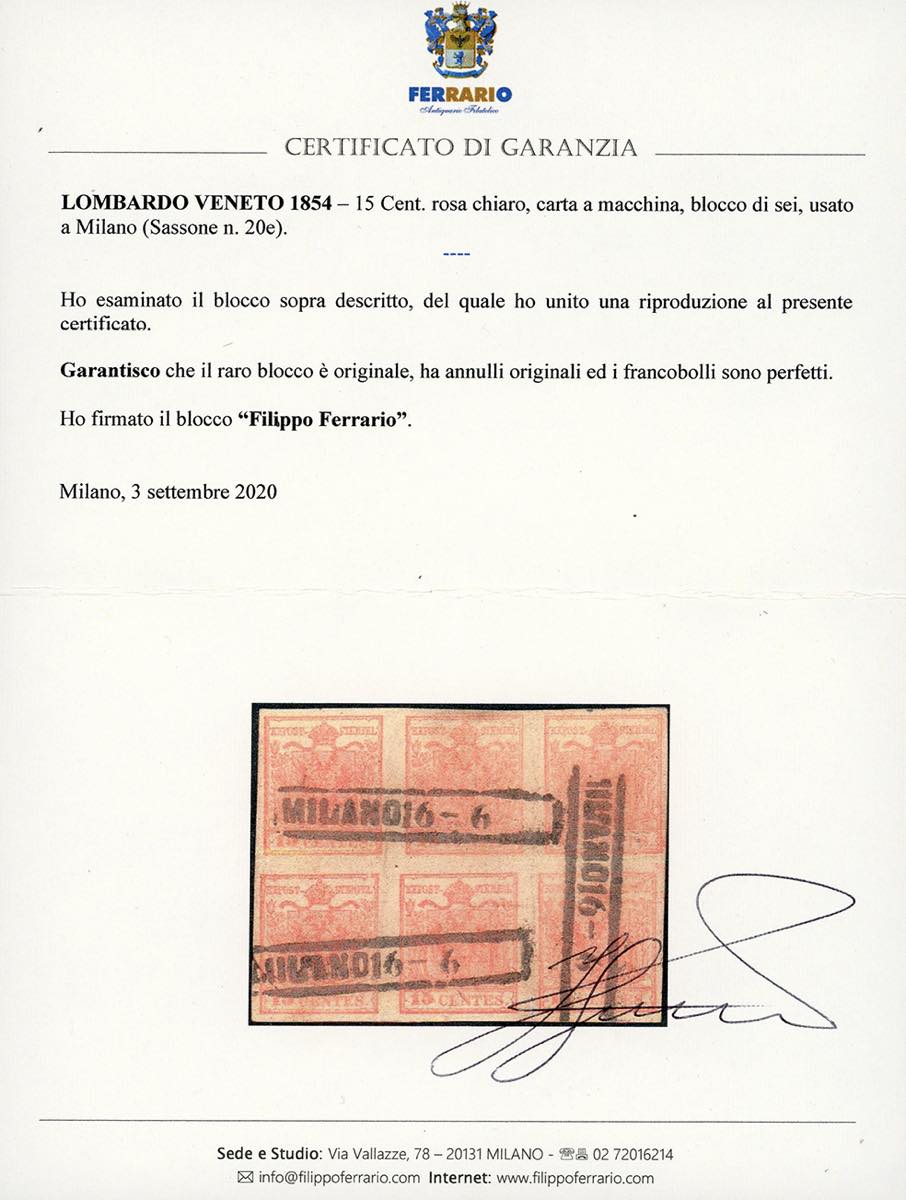 1854 - 15 cent. rosa chiaro, carta a macchina (20e), eccezionale blocco di sei, perfetto, usato a Milano. Molto bello e raro! Cert. Ferrario (Sassone quota € 6.500 il blocco di quattro).