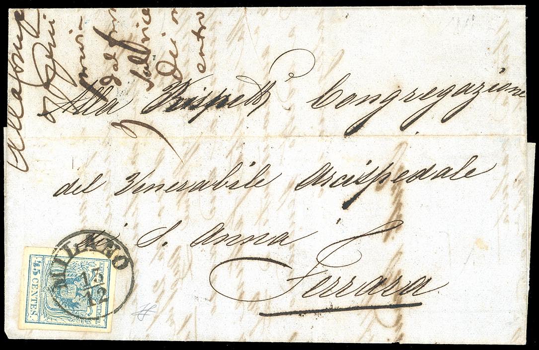 1857 - 45 cent. azzurro, carta a macchina (22), perfetto e ben marginato, su lettera da Milano 15/12/1857 a Ferrara. Ferrario.