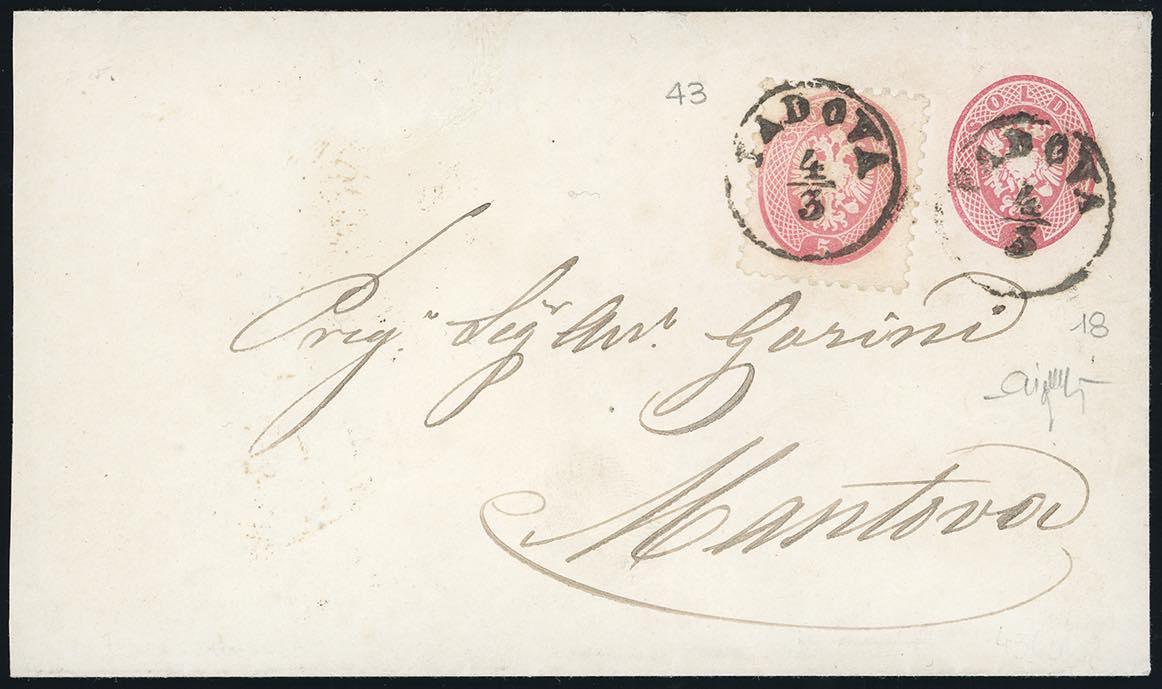 1864 - 5 soldi rosa carminio, busta postale (18), integrata con 5 soldi rosa, dent. 9 1/2 (43), perfetti, da Padova 4/3 a Mantova. ... Leggi tutto