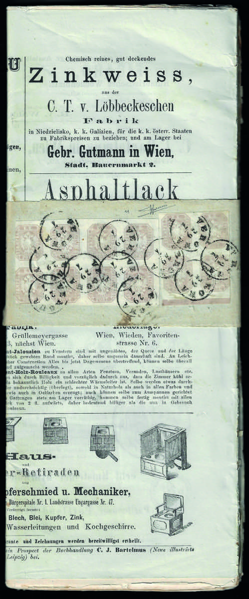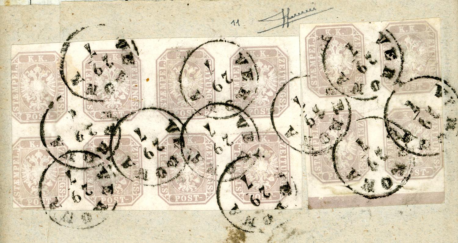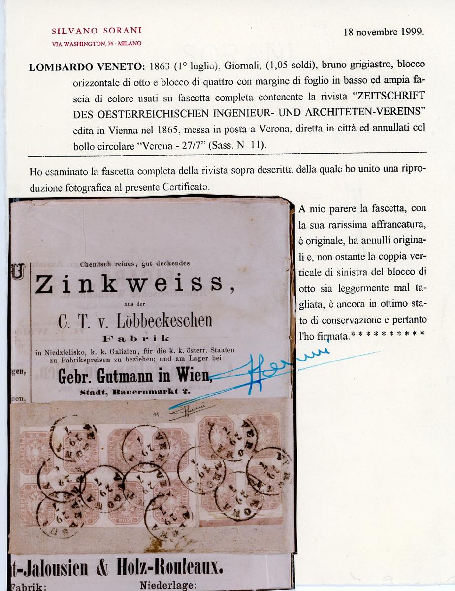 1865 - 1,05 soldi bruno grigiastro (11), blocchi di otto e di quattro, questo con ampio margine di foglio in basso e fascia di colore, margine sinistro del blocco di otto leggermente sfiorato, su fascetta, completa di giornale, da Verona 29/7/1865 per città. ECCEZIONALE AFFRANCATURA MULTIPLA DI GRANDE FRESCHEZZA E RARITA'. Cert. Sorani.