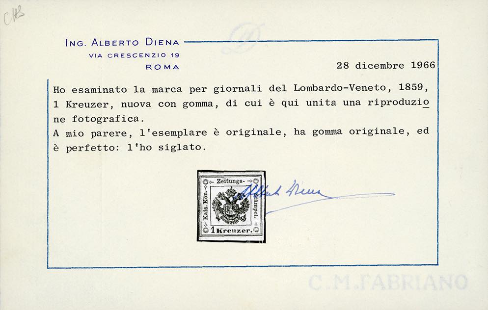1859 - 1 kr. nero (2), gomma originale, perfetto. Raro. Cert. A.Diena e Ferrario.